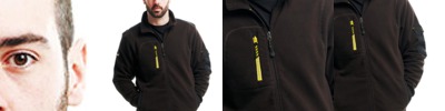 3-layer softshell fabric with breathable membrane and bonded microfleece lining, water resistant to 5000mm. Side pockets and chest pocket with inner lining, reversed zip and cord pulls. Full zip with inner storm flap and zip neck protector at collar. Bungee cord in hem. Adjustable cuffs. Drop tail. Large left chest side decoration access.