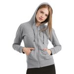 PST/Perfect Sweat Technology. Beautiful sweatshirt for women. Hooded with full length zip. Matching colour single jersey lined hood. Kangaroo pockets. Gathering on pockets and sleeve shoulders. Cuffs and hem in 2x2 rib. Star-shaped zip puller.