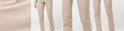 Enzyme washed fabric. Modern style. Flat front. Belt loops. Zip fly with button over. Two side pockets.