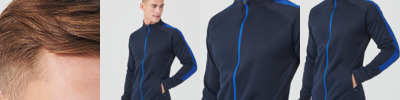 Knitted tracksuit top with contrast colour panels on outer sleeve. Contrast colour centre front zip. Zipped side pockets. Funnel neck and 1x1 ribbed cuffs. Semi-automatic lock zip sliders on all zips.