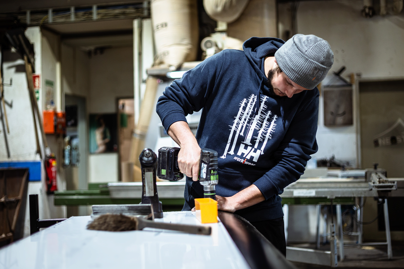 79264 • NAVY MELANGE • 590 Features Front hand warmer pocket Rib-knit at bottom sleeve and hem Adjustable hood with drawcord Composition Main fabric: 80% Cotton, 20% Polyester - 300 g/m² Weight gms 730 Fitting Regular