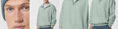 Unisex boxy dry hand feel quarter zip sweatshirt. Set-in sleeve. Neck collar in self-fabric. Herringbone tape at inside back neck and at inside of zip. Quarter zip at centre front. 2x1 rib at sleeve hem and bottom hem. Armhole, sleeve hem and bottom hem with twin-needle topstitch. GOTS certified. Fairwear certified. Vegan certified.