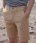Flat front chino short. Tag free. Stretch fabric for ease of movement. Slanted front pockets. 2 x back welt pockets. Belt loops. Plain hem. BSCI certified.