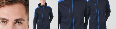 Contemporary softshell jacket with 3 piece hood. Contrast colour panelling on shoulders and upper sleeve. Soft-touch Jersey fabric with bonded microfleece reverse. Zipped chest and side pockets and contrast colour centre front zip with non-slip gripper zip pulls. Side body panels with topstitching. Dropped back hem. Stretch binding at cuffs and hem. Set-in sleeves. BSCI certified.